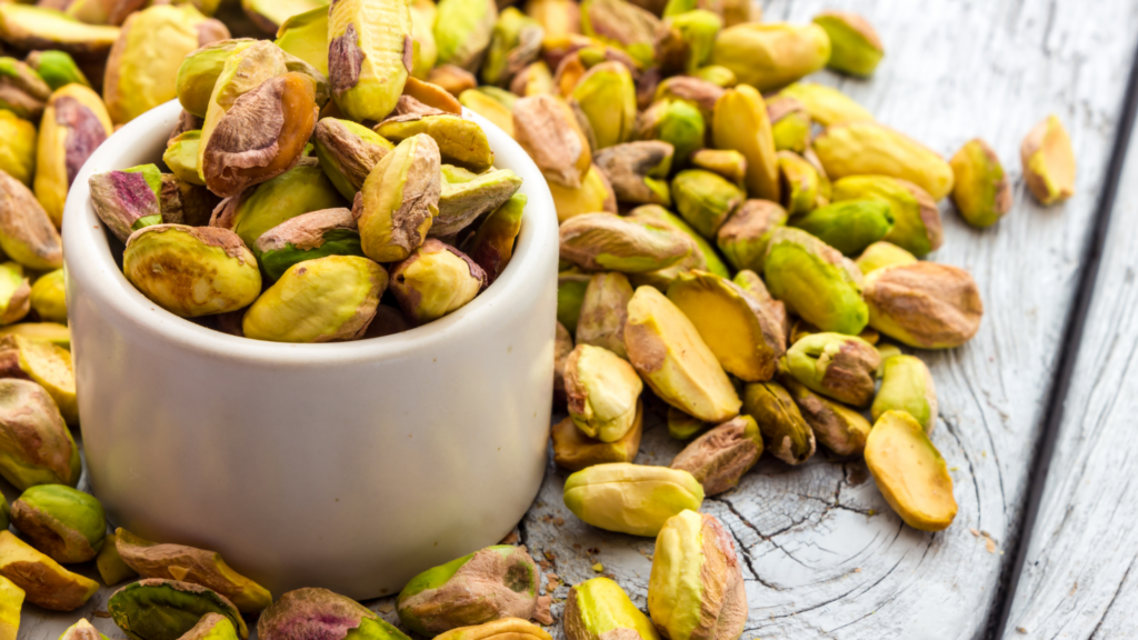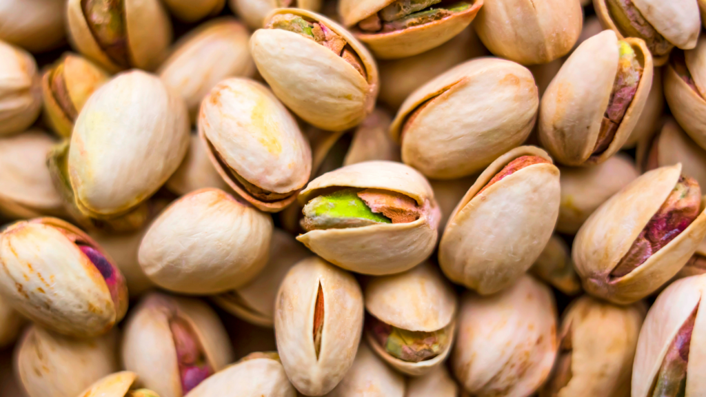 - Zdrowe tłuszcze: pistacje są bogate w nienasycone kwasy tłuszczowe, które wspierają zdrowie serca i obniżają poziom cholesterolu.